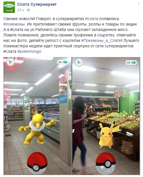 Сильнейшим интересом к игре решили воспользоваться маркетологи крупной иркутской торговой сети «Слата». В социальных сетях они объявили конкурс на лучшее фото с хэштегом #Покемоны_в_Слате!