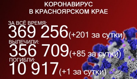 5 августа в Красноярском крае выявили ещё 201 больного коронавирусом. Количество летальных случаев достигло 10 917, за сутки скончался один ковидный пациент. 85 человек сумели выздороветь, 44 пришлось госпитализировать.