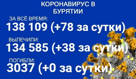 По данным на 3 августа, еще 78 человек в Бурятии заболели коронавирусом. Также за сутки 38 пациентов выздоровели. Летальных исходов зарегистрировано не было. Об этом сообщает пресс-служба регионального Роспотребнадзора.