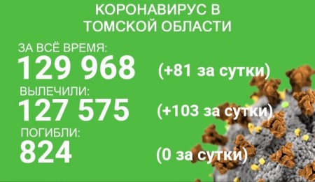 По состоянию на 1 мая в Томской области зарегистрировано 129 968 случаев новой коронавирусной инфекции. В минувшие сутки заболел 81 житель региона, госпитализированы 8 больных. С начала эпидемии излечились 127 575 человек. За сутки с 30 апреля по 1 мая выздоровели 103 пациента.