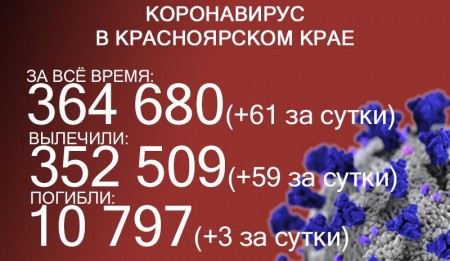 3 мая в Красноярском крае выявили ещё 80 больных коронавирусом. Общее число заболевших достигло 364 272. За всё время выздоровел 352 031 человек, в том числе 132 за последние сутки. Количество погибших составляет 10 781.