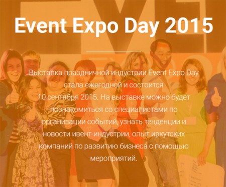 Выставка ивент-индустрии Event Expo Day 2015 состоится 10 сентября в Байкал Бизнес Центре. Она пройдет в рамках Недели бизнеса в Иркутске. Более 50 экспонентов из праздничной индустрии Иркутска примут участие в выставке — это ивент- и промоагентства, компании, обслуживающие мероприятия.
