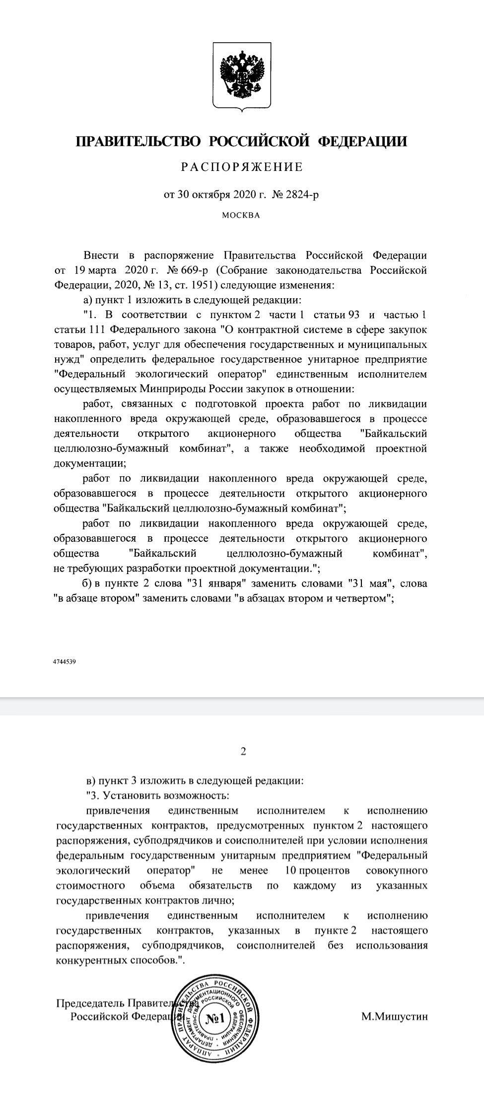 Правительство России в третий раз сменило предприятие, которое будет заниматься ликвидацией накопленных отходов Байкальского целлюлозно-бумажного комбината. Теперь этим займется ГУП «Федеральный экологический оператор», подразделение «Росатома». Постановление правительства опубликовано на официальном портале правовой информации 2 ноября.