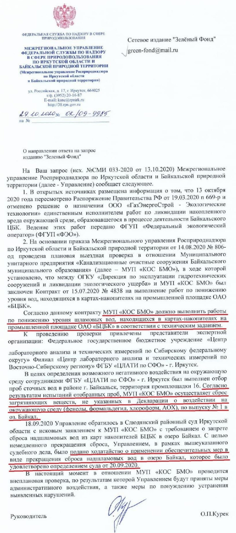 В конце октября Росприроднадзор вышел на внеплановую проверку МУП «КОС БМО» из Байкальска, которое подозревают в сбросе недостаточно очищенных надшламовых вод из карт-накопителей АО «БЦБК» в озеро Байкал. Руководитель межрегионального управления Росприроднадзора по Иркутской области и Байкальской природной территории Ольга Курек сообщила «Зеленому Фонду», что еще в июле 2020 года был заключен контракт на выполнение работ по понижению уровня вод, находящихся на промплощадке БЦБК, исполнителем по которому выступило муниципальное предприятие «Канализационные очистные сооружения Байкальского муниципального образования». Стоит отметить, это было необходимо для предотвращения переполнения шламовых карт и попадания загрязненных надшламовых вод вообще без какой-либо очистки в Байкал в период паводка.