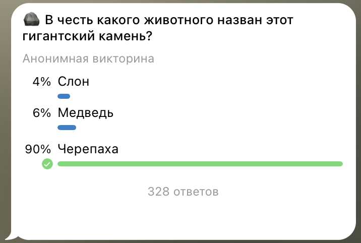 Телеграм-канал «Бурятия. Бабр. Дальше некуда» спросил читателей, в честь какого животного назван этот гигантский камень. Результаты превзошли ожидания: 90 % знают, что это Черепаха.