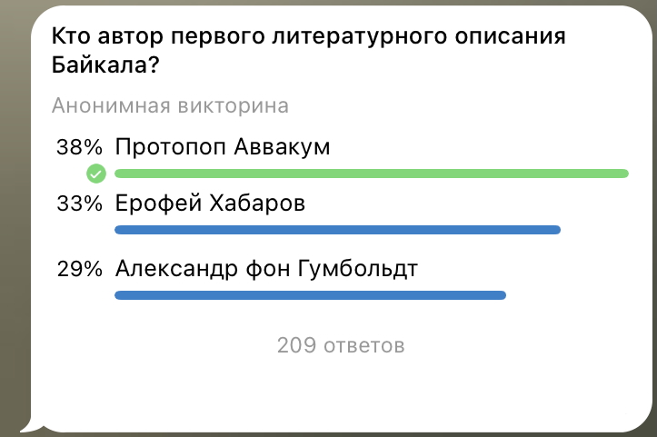Телеграм-канал «Бурятия. Бабр. Дальше некуда» спросил у читателей, кто автор первого литературного описания Байкала. На этот раз голоса почти равномерно распределились между тремя вариантами, но большинство читателей всё же угадало, что это Протопоп Аввакум.