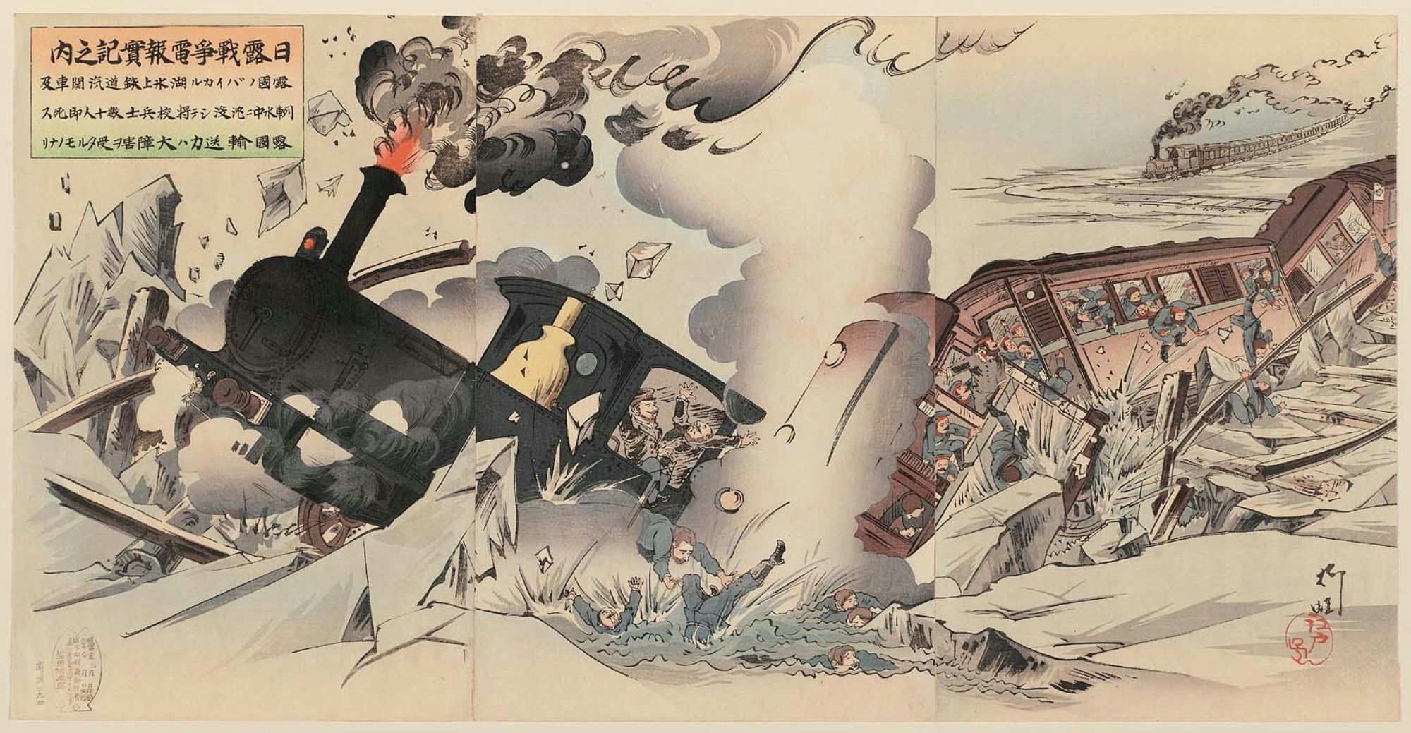 В одном из таких отпечатков 1904 года японский художник Кокунимаса (Utagawa Kokunimasa) запечатлел сеанс «телеграфной новости»: паровоз и вагоны тонут вместе с офицерами и солдатами, что, по японской интерпретации, серьёзно «повредило транспортный потенциал России».