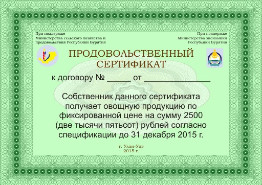 Социальный проект «Продовольственный сертификат» разработан в рамках поддержки местных сельхозпроизводителей. Каждый желающий может приобрести сертификат за 2500 рублей и получить 170 килограмм овощей: картофель, капусту, лук, морковь и свеклу от местных производителей. Свежие овощи доставят жителям Бурятии во время уборки урожая: с середины сентября по 30 ноября.
