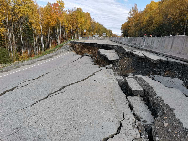 Днём 22 сентября в соцсетях появился видеоролик, на котором показано обрушение асфальта и разлом на федеральной трассе «Байкал». Очевидцы предположили, что причиной разлома стало землетрясение, но специалисты-дорожники заявили, что это не так.