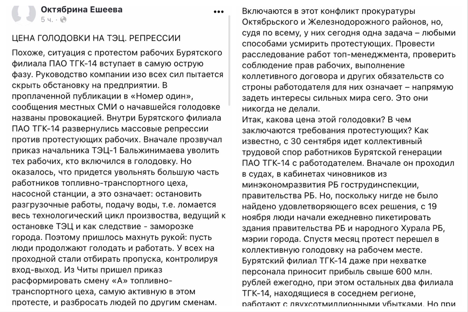 • Акции протеста энергетиков начались в ноябре: сотрудники ТГК-14 устраивали одиночные пикеты у здания правительства Бурятии. О том, что происходит на предприятиях ТГК-14 и почему работники готовы на более масштабные акции протеста, Бабр подробно писал ранее: «Большинство работников у черты бедности». В Бурятии продолжаются протесты против ТГК-14