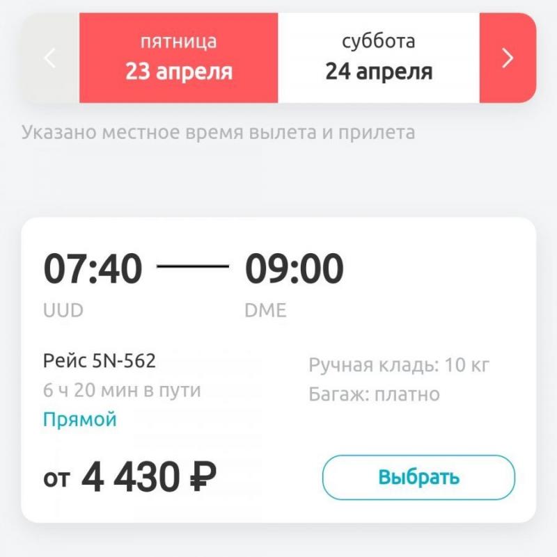 Директор аэропорта “Байкал” Дмитрий Гармаев в Фейсбуке удивился дешевым авиабилетам до Москвы от компании “Smartavia”. Он опубликовал скриншот с ценой билета на 23 апреля, где стоимость без учета багажа составила 4430 рублей. Дмитрий Гармаев сравнил эту сумму с тарифами на поездки в такси, причем не в пользу таксистов.