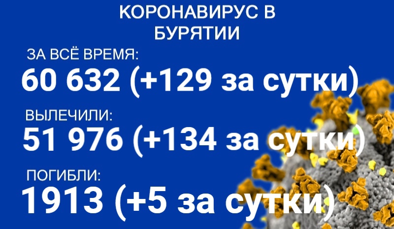 По данным на 15 октября, еще 129 человек в Бурятии заболели COVID-19. Также за сутки 134 пациента выздоровели, еще пять скончались. Об этом сообщает пресс-служба регионального Роспотребнадзора.
