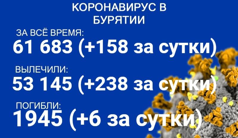 По данным на 22 октября, еще 158 человек в Бурятии заболели COVID-19. Также за сутки 238 пациентов выздоровели, еще шесть скончались. Об этом сообщает пресс-служба регионального Роспотребнадзора.