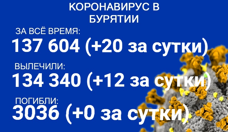 По данным на 21 июля, еще 20 человек в Бурятии заболели коронавирусом. Также за сутки 12 пациентов выздоровели. Летальных исходов зарегистрировано не было. Об этом сообщает пресс-служба регионального Роспотребнадзора.
