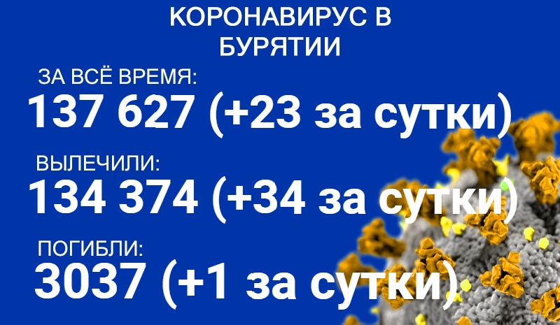 По данным на 22 июля, еще 23 человека в Бурятии заболели коронавирусом. Также за сутки 34 пациента выздоровели, один скончался. Об этом сообщает пресс-служба регионального Роспотребнадзора.