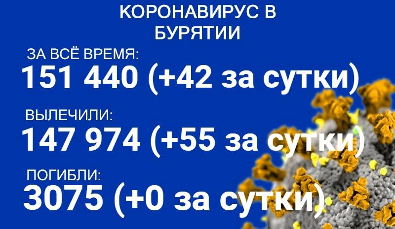По данным на 12 октября, еще 42 человека в Бурятии заболели коронавирусом. Также за сутки 55 пациентов выздоровели. Летальных исходов зарегистрировано не было. Об этом сообщает пресс-служба регионального Роспотребнадзора.
