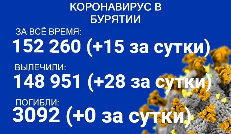 По данным на 7 ноября, еще 15 человек в Бурятии заболели коронавирусом. Также за сутки 28 пациентов выздоровели. Летальных исходов зарегистрировано не было. Об этом сообщает пресс-служба регионального Роспотребнадзора.