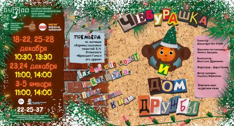В понедельник в Государственном Бурятском академическом театре драмы имени Хоца Намсараева пройдёт спектакль «Чебурашка и Дом Дружбы» по мотивам сборника сказочных повестей Эдуарда Успенского «Крокодил Гена и его друзья».