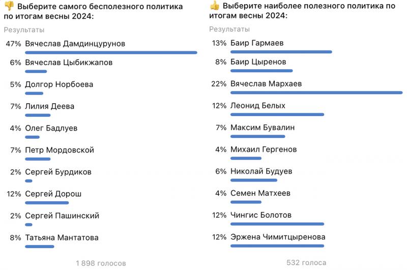 В телеграм-канале «Бурятия. Дальше некуда» читатели оценили качество работы политиков Бурятии, учитывая как их многолетний труд, так и достижения за последнее время. Бабр представляет итоги опросов, в которых предлагалось выбрать наиболее эффективных представителей власти и тех, кто не оправдал ожидания жителей республики по итогам весны 2024 года.