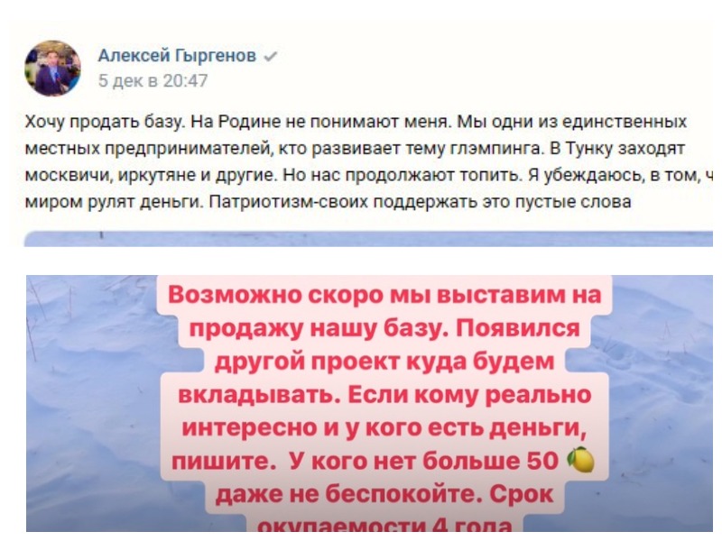 «Хочу продать базу. На Родине не понимают меня. Мы одни из единственных местных предпринимателей, кто развивает тему глэмпинга. В Тунку заходят москвичи, иркутяне и другие. Но нас продолжают топить», — пишет Гыргенов на своей странице ВКонтакте. При этом предприниматель сразу обозначил, что у него есть дополнительный инвестиционный бизнес-проект. Цена вопроса — 50 миллионов рублей, срок окупаемости — четыре года.