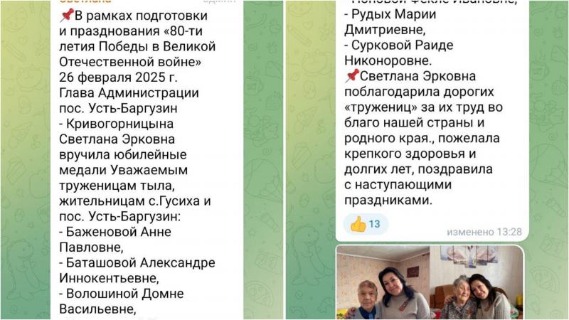 В Усть-Баргузине проживает 6080 человек по данным на 2024 год. Тружеников тыла, имеющих право на медаль к 80-летию Победы, — единицы. Исключение нескольких имён из списка награждённых ещё можно назвать техническим сбоем или досадной ошибкой. Но когда убирают только одно имя, а после это никак не комментируют, то злой умысел становится явным. Каждый случай пренебрежения к труженикам тыла подрывает доверие к власти, особенно в год юбилея.