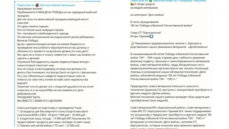 Светлана Кривогорницына 25 апреля объявила о необходимости сбора средств для празднования 9 мая из-за отсутствия целевого бюджета. Смета расходов впечатляет: штандарты для «Бессмертного полка» (20 тысяч рублей), солдатская каша (15 тысяч рублей), презенты «детям войны» (170 человек, 22 тысячи рублей), ремонт памятников в Максимихе и Усть-Баргузине (20 тысяч рублей), конкурс патриотической песни (25 тысяч рублей), спортивные мероприятия (12 тысяч рублей), подарки труженикам тыла (20 человек, 20 тысяч рублей), ремонт палисадника «Парк Волна», изготовление ограждений для площади (25 тысяч рублей), салют (21 тысяча рублей), значки для забега (10 тысяч рублей).