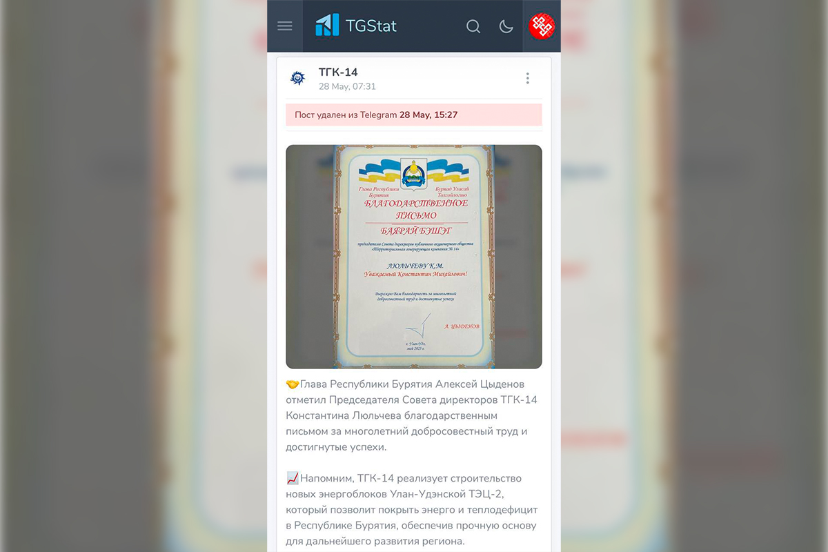 Интересно, что задержания Люльчева и Мясника совпали с заметной текучкой кадров на верхах. Только за последние месяцы в ТГК-14 сменилось несколько руководителей на ключевых постах, в том числе в управлении ремонтами и снабжением. На фоне громких заявлений о модернизации и «перезагрузке» структуры компания фактически утратила влияние. Даже из тг-канала самой компании тихо удалили пост о вручении Люльчеву почётной грамоты.