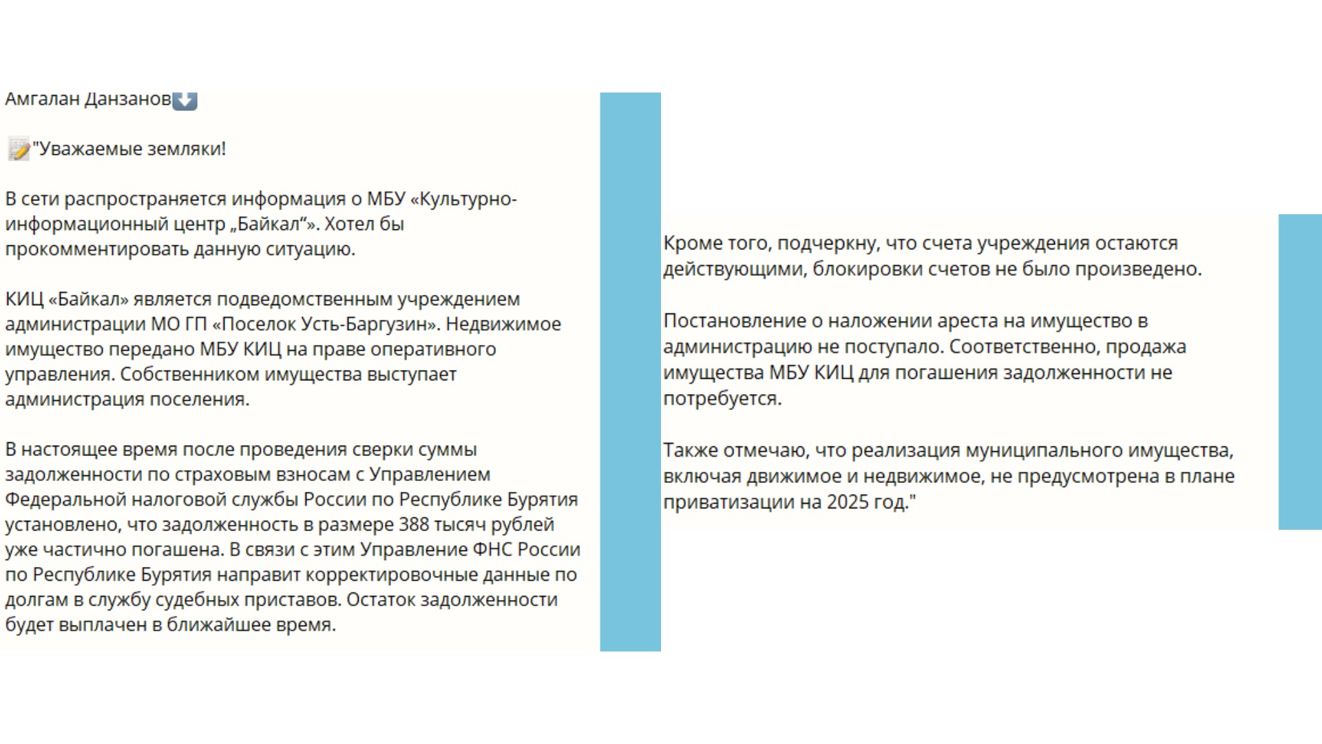 3 октября глава Баргузинского района Амгалан Данзанов прокомментировал арест имущества культурно-информационного центра «Байкал». Чиновник заверил жителей, что задолженность частично погашена, ареста на имущество не было, а его продажа не потребуется. Однако официальный документ Федеральной службы судебных приставов (ФССП) от 23 сентября, находящийся в распоряжении Бабра, фиксирует, что судебный пристав-исполнитель наложил запрет на любые регистрационные действия в отношении всего недвижимого имущества учреждения, включая здания домов культуры в Усть-Баргузине, Максимихе и Гусихе.