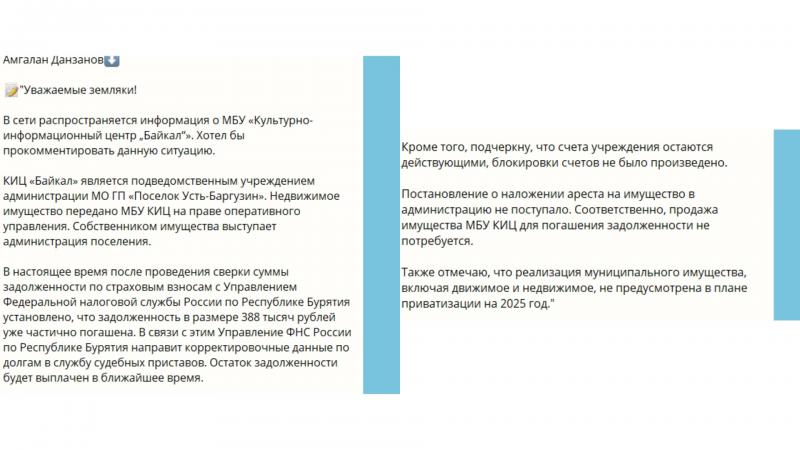 3 октября глава Баргузинского района Амгалан Данзанов прокомментировал арест имущества культурно-информационного центра «Байкал». Чиновник заверил жителей, что задолженность частично погашена, ареста на имущество не было, а его продажа не потребуется.