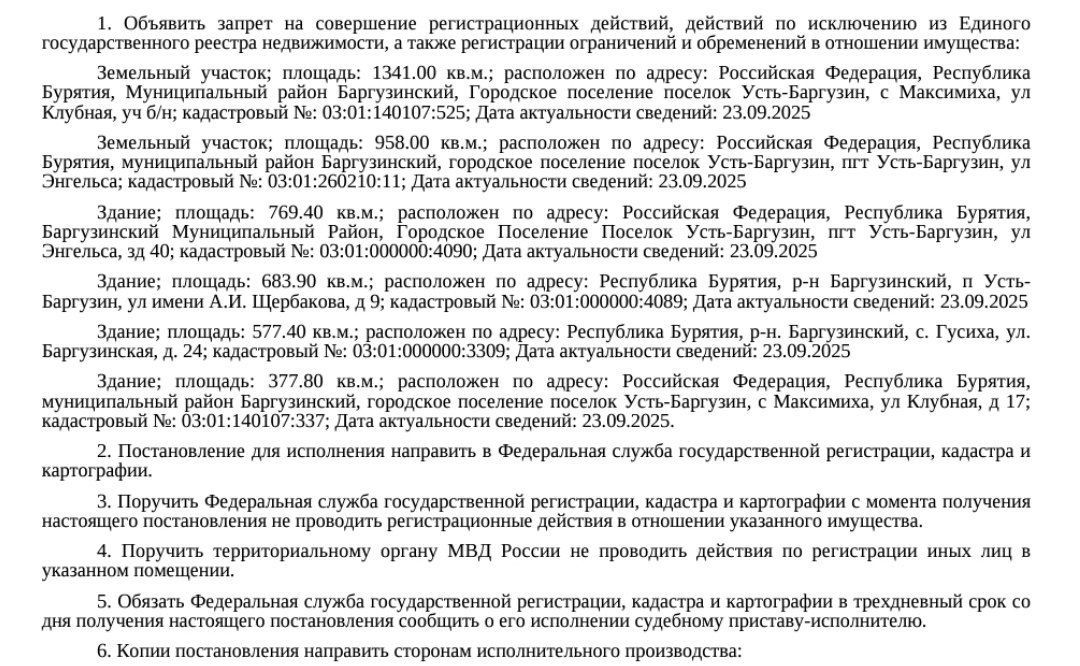 «Постановление о наложении ареста на имущество в администрацию не поступало», — сообщает глава Баргузинского района. Однако согласно закону «Об исполнительном производстве», постановление о запрете регистрационных действий направляют именно должнику (то есть МБУ «Культурно-информационный центр») и в Росреестр. Администрации района и поселения не входят в число обязательных адресатов.