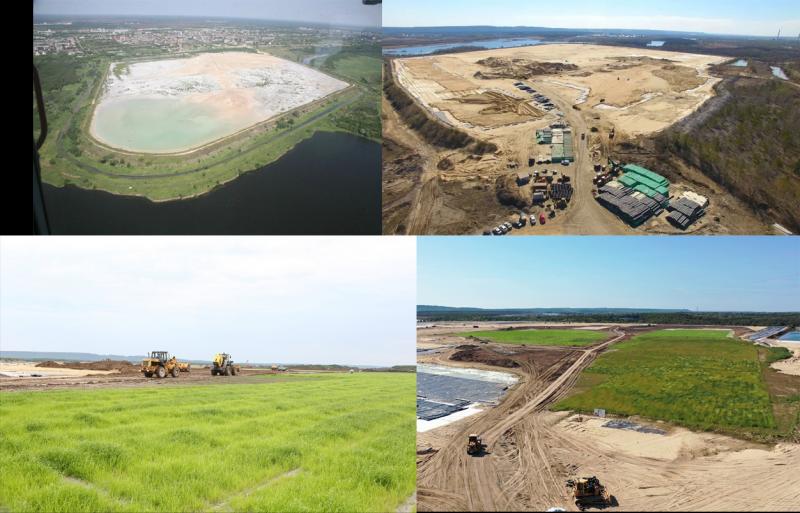 На площади более 70 гектаров старого шламонакопителя с помощью мембранной технологии была уложена многослойная защитная конструкция: песок, бентонитовые маты, геомембрана, геотекстиль, растительный грунт и биоматы. Весной территория покрылась травой и стала безопасной площадкой.