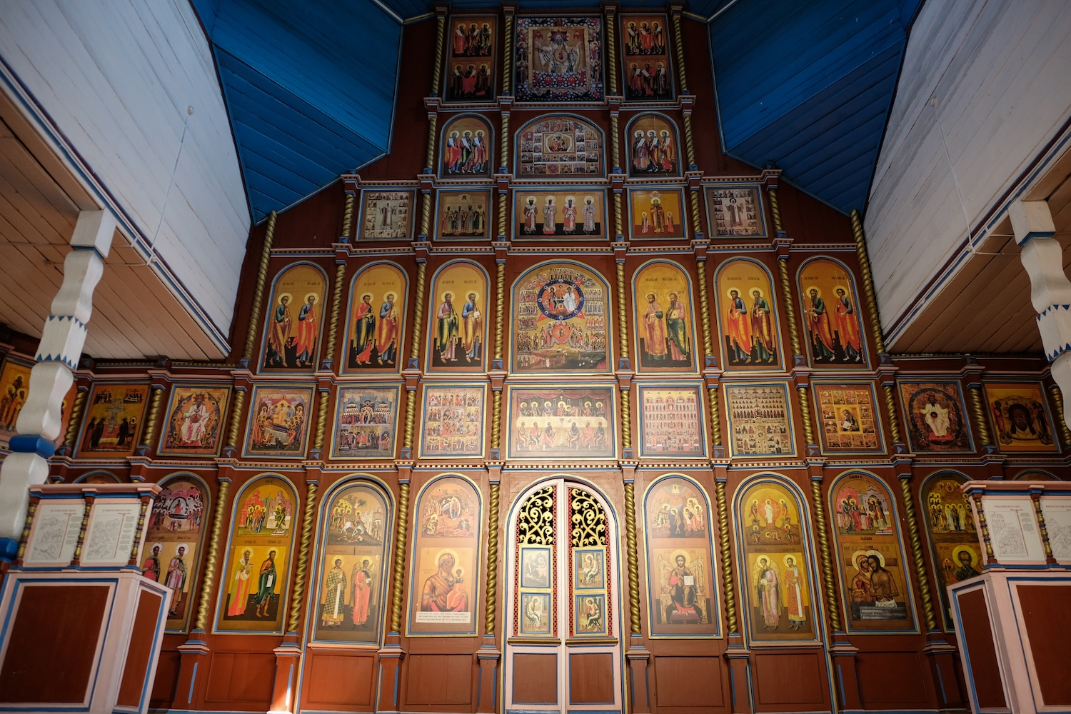 В центре Этнографического музея стоит старообрядческая Никольская церковь – подлинный старообрядческий храм начала XX века, построенный в селе Никольском на средства местных прихожан‑семейских (ее вы могли видеть в начале фоторепортажа). В 1930‑е годы ее закрыли и использовали как склад, а в 1971 году разобрали и перевезли в музей. Реставрация завершилась только к 1977 году, а иконостас открыли для посетителей в 1998 году.