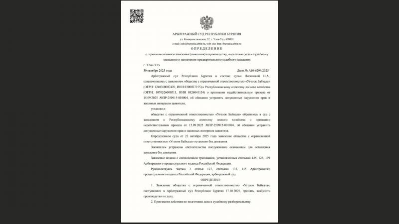 Компания ООО «Уголок Байкала» 22 октября подала иск в Арбитражный суд Бурятии к Республиканскому агентству лесного хозяйства (РАЛХ). Предприниматели требуют признать незаконным приказ ведомства, который заблокировал их проект по созданию рекреационной зоны в Прибайкальском районе. Заседание пройдёт 24 ноября.