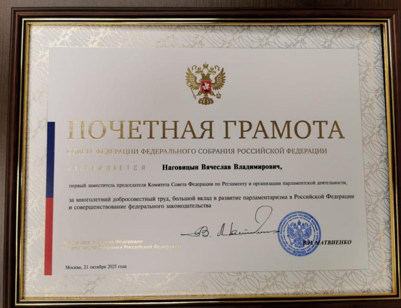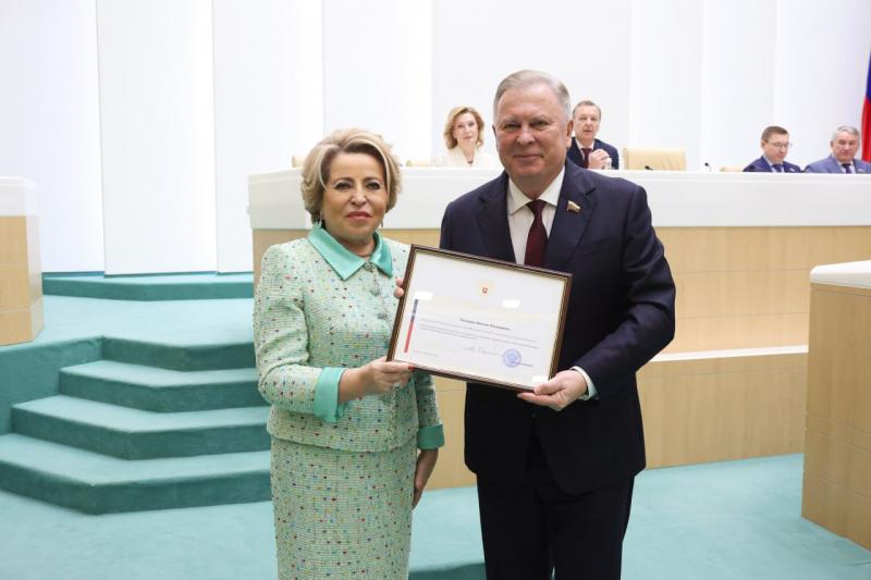 Вячеслав Наговицын и Валентина Матвиенко с почётной грамотой