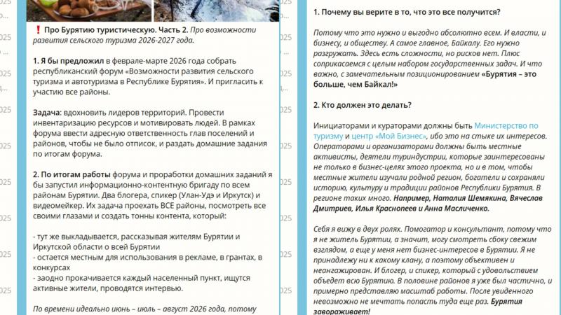 План блогера по спасению бурятского туризма на 2026-2027 годы: проведение форума для «вдохновения» глав районов, затем запуск «информационно-контентной бригады» для создания массы контента по всем уголкам Бурятии, потом на базе центра «Мой бизнес» создаётся акселератор для обучения заинтересованных предпринимателей, после проходит второй форум для отбора самых топовых районов по итогам прошедших мероприятий и, наконец, их продвижение.
