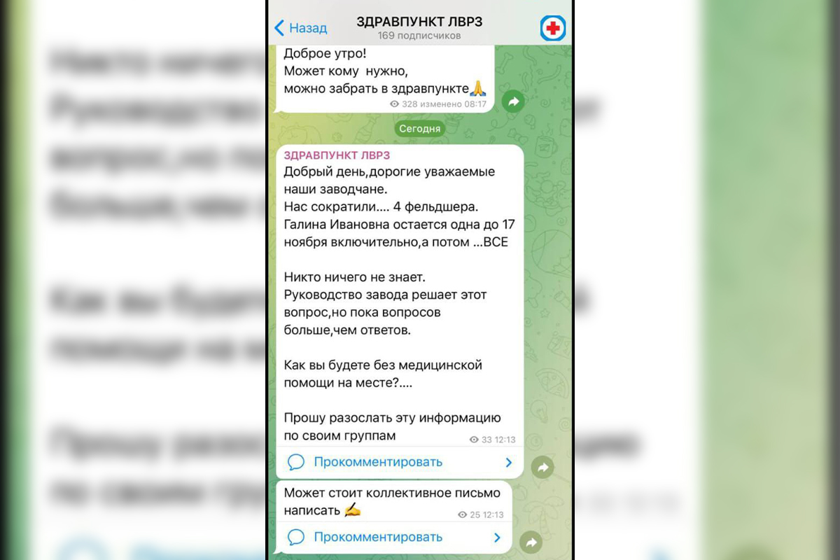 На ЛВРЗ обострилась проблема с медицинской помощью для работников. По данным источника, штатный медпункт фактически ликвидирова, а вместо него на предприятие направили сотрудников ЧУЗ «РЖД-Медицина». Завод дал официальный ответ, якобы «всё остаётся как было, фельдшера переходят в поликлинику». Но работники сразу опровергли эту информацию.