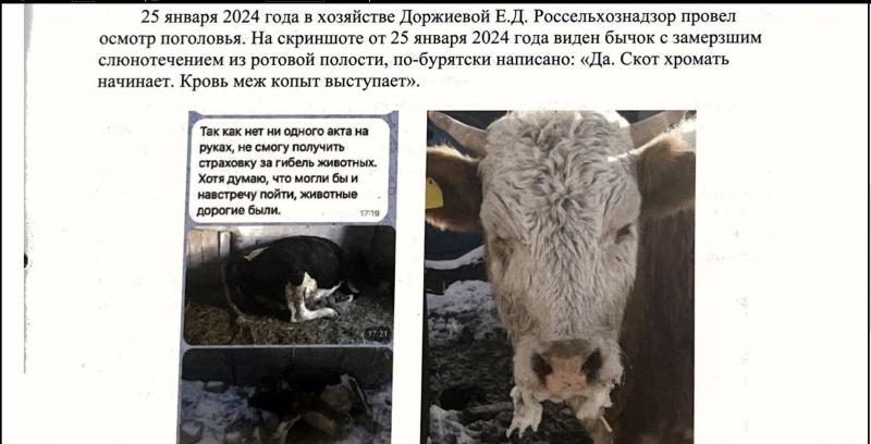 Статья 44 Федерального закона № 414 возлагает ответственность за эпизоотическое благополучие на органы власти. Признание ящура немедленно остановило бы экспорт мяса. Чиновники выбрали способ спрятать проблему через подмену диагнозов. Например, в акте осмотра трупа телёнка из хозяйства Доржиевой от 15 февраля 2024 года начальник филиала БРСББЖ Мансурунов поставил диагноз «истощение».