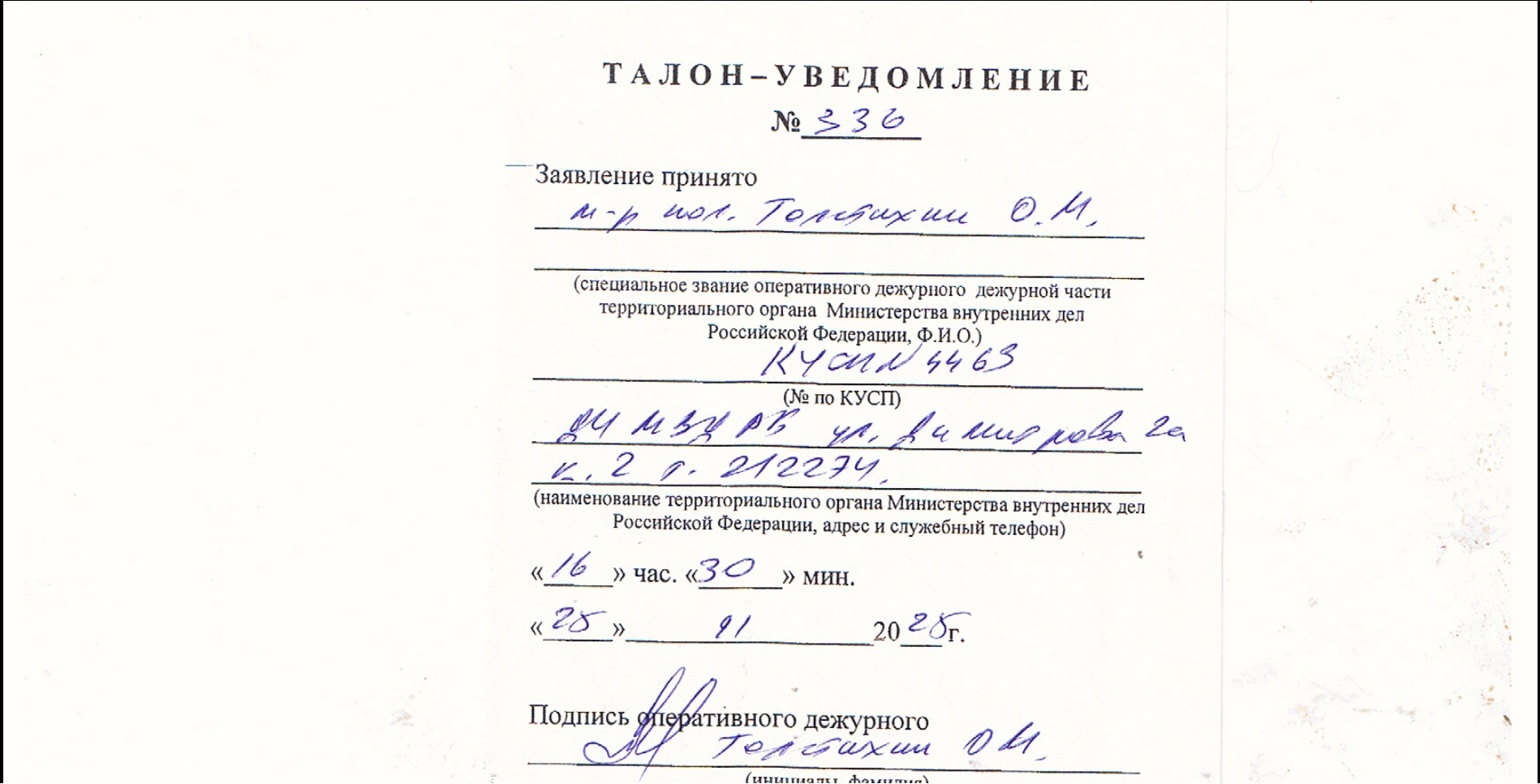 Талон-уведомление № 336 от 25 ноября 2025 года о принятии заявления в МВД РБ