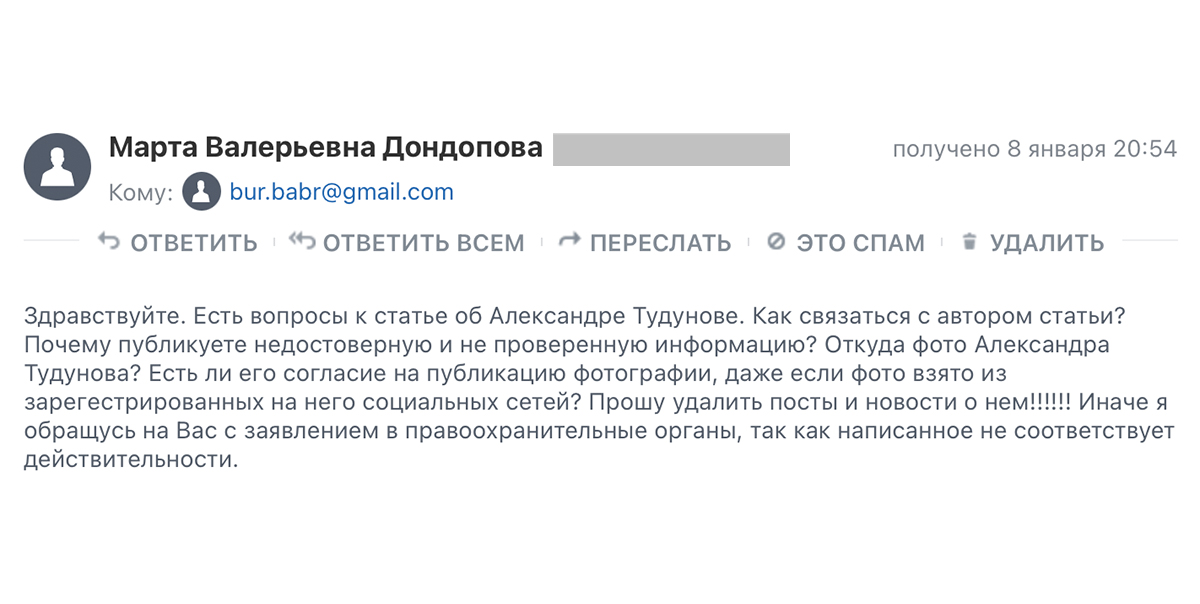 После публикации предыдущей статьи редакция получила ряд писем с обвинениями в «дезинформации» и угрозами заявлений в правоохранительные органы. Адресовано это было от имени некой Марты Дондоповой, которая настойчиво требовала удалить публикации и интересовалась, на каком основании мы использовали фото экс-чиновника. Позже нам стало известно, что женщина является родной сестрой Тудунова и по совместительству сотрудницей полиции в Баргузинском районе. Все её вопросы, полагаем, теперь можно адресовать непосредственно в Верховный суд республики.