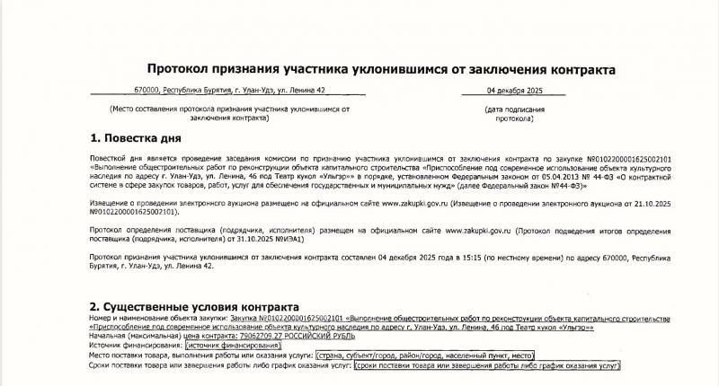 Управление капитального строительства (УКС) Бурятии в отчаянии делит крупный заказ на мелкие части, пытаясь хоть как-то привлечь исполнителей. В феврале 2026 года чиновники объявили четыре новых аукциона на общую сумму 230 миллионов рублей. Срок сдачи — 31 августа. Власти обещают, что театр распахнёт двери к следующему сезону.