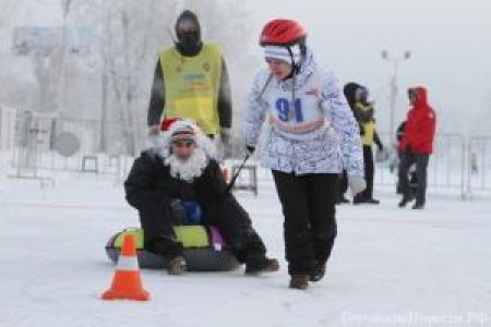 Традиционные шуточные спортивно-развлекательные соревнования "Это вам не плюшки со стола таскать" прошли в Красноярске в пятницу 6 января. Суть состязания проста: нужно преодолеть 150-метровую полосу препятствий на "плюшке". Причем роль пассажира выполняет муж, а везет его по трассе супруга.