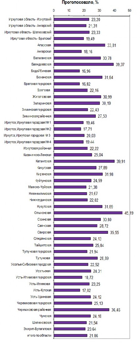 Это данные системы ГАС "Выборы". В 2011 году явка к этому часу составила - 28,14%. Отстаем. Уже сейчас можно спрогнозировать, что итоговая явка в Иркутской области будет в районе 35-37%. До 40% доберется вряд ли.