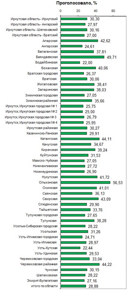 Иркутская область проваливает выборы в Госдуму VII созыва. 28.88% пришло на участки к 18 вечера по местному времени. Такие данные дает система ГАС "Выборы". Для сравнения: в 2011 году явка на 18 часов перевалила за 40%.