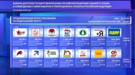 ЦИК в режиме онлайн публикует результаты подсчета голосов в целом по России. Обработано более 10% протоколов.