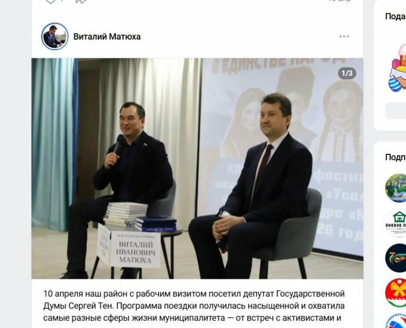 У депутатов Госдумы тоже горячая пора, поскольку осенью предстоят выборы нового созыва. Поэтому, судя по страницам мэров соответствующих территорий, народные избранники на время забыли о столичных делах. Так, Сергей Тен прямо пашет округ, фигурируя на многих снимках. Даже красный, по идее, мэр Усольского района Виталий Матюха помогает Сергею Юрьевичу. И колбасой же не подавится. Ведь, на минуточку, от этого же округа выдвигают кандидатом от КПРФ экс-министра и отпрыска соответствующей династии Илью Сумарокова.