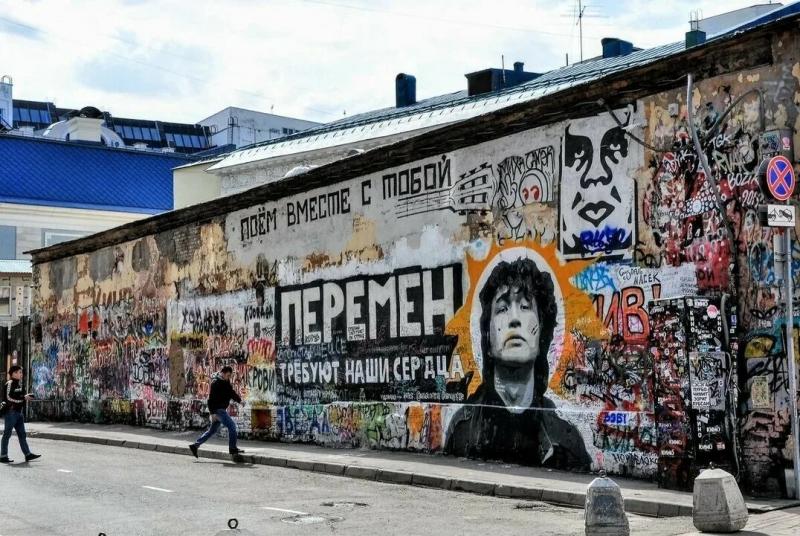 Возник этот народный мемориал в 1990 году – 15 августа здесь появилась надпись «Сегодня погиб Виктор Цой», а позже кто-то добавил «Цой жив». Со временем стена полностью покрылась надписями, цитатами из песен и признаниями в любви. Ее уже и закрасить пытались, а в 2025-м, наоборот, реставрировали. Здесь вот до реставрации.