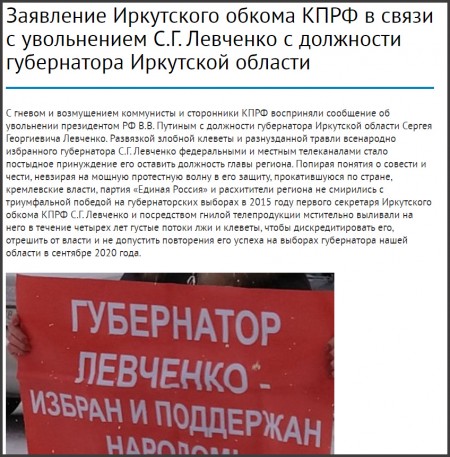 Наутро после добровольной отставки губернатора Сергея Левченко, иркутский обком КПРФ опубликовал громогласное заявление в стиле 30-х годов XX века.