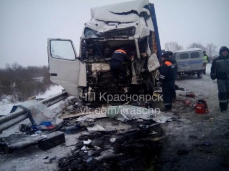 Два грузовика "Вольво" столкнулись на заснеженной трассе М53 под Ачинском. По предварительным данным, одна из фур выехала на встречную полосу, где на полном ходу влетела в другой грузовик. Столкновение было настолько сильным, что кабину одной из фур буквально вмяло в фургон.