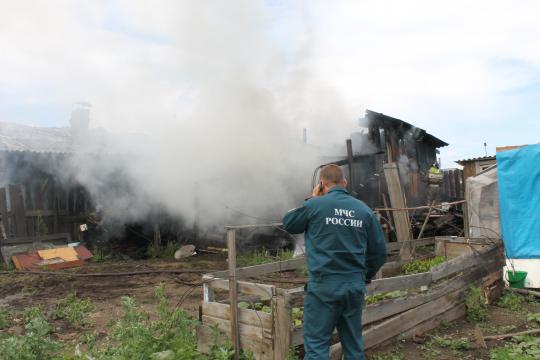 В этот же день, 29 июня, на улице Бурлова в Усолье-Сибирском потушить огонь в начале возгорания не успели - загорелось быстро. Хозяйка, молодая мама, была дома с ребенком. Во дворе загорелся деревянный сарай, где хранились зимние вещи – одежда и обувь. Когда прибыли пожарные, сарай уже вовсю горел. Удалось отстоять жилые дома, но баню соседей огонь все же успел повредить. У семьи погибли куры, которые находились в клетке рядом с горящим сараем. Причину возгорания установит экспертиза. Хозяева уверяют, что проводки в сгоревшем помещении не было, но специалисты в этом не уверены и выдвигают предварительную версию – замыкание электропроводки.