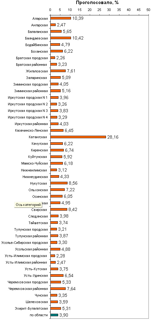 Сельские территории традиционно выбились в "лидеры производства" не дожидаясь обеда. Особо на этом поприще выделяется Катанский район с явкой более 28%. Также стоит отметить Баяндаевский и Аларский районы с явкой более 10%.